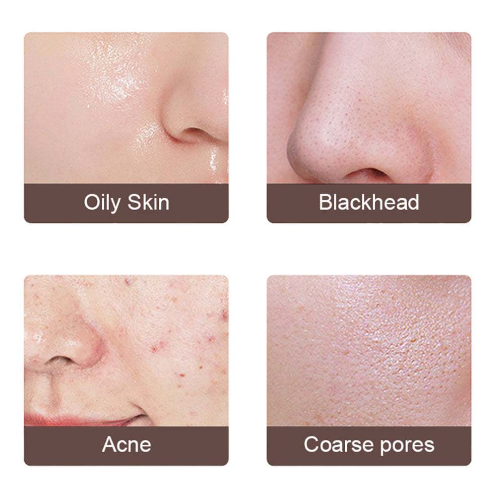 Close-up images showing oily skin, blackheads, acne, and coarse pores targeted by Electric Ultrasonic Skin Scrubber for facial cleansing and skin improvement